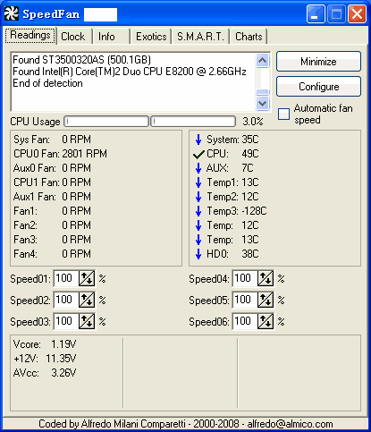 第一次启动SpeedFan,SpeedFan会自动检测电脑的硬件情况,这个过程需要花1分左右时间。