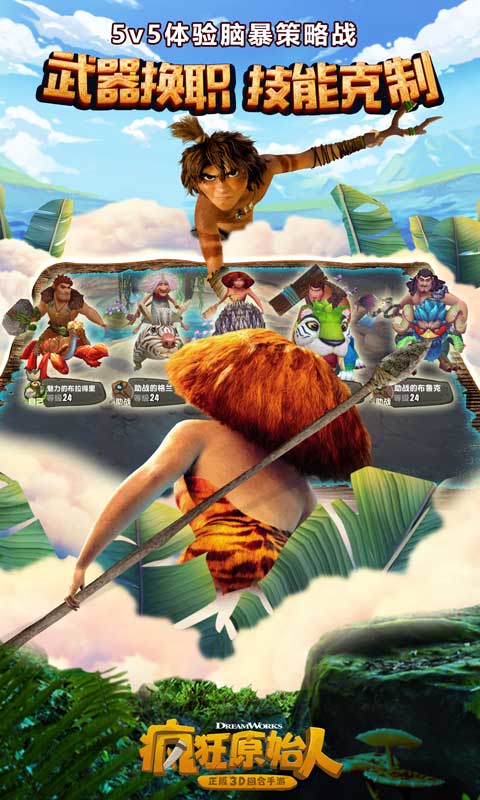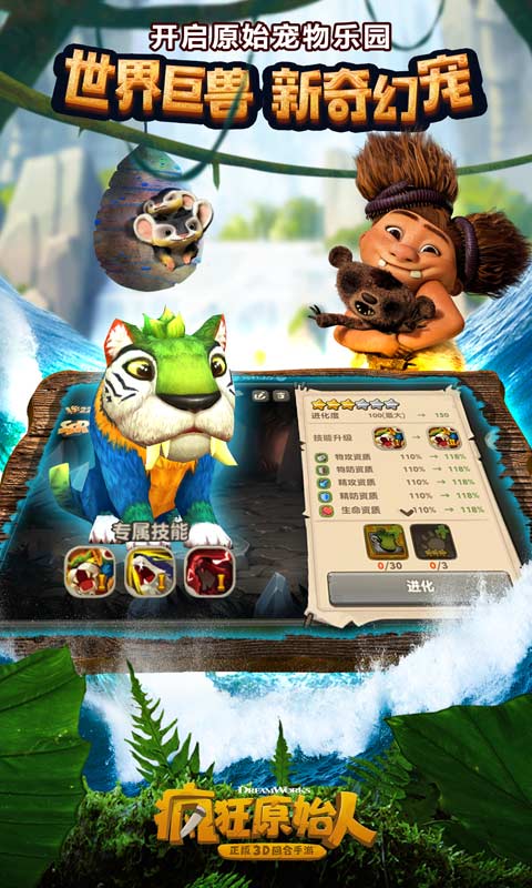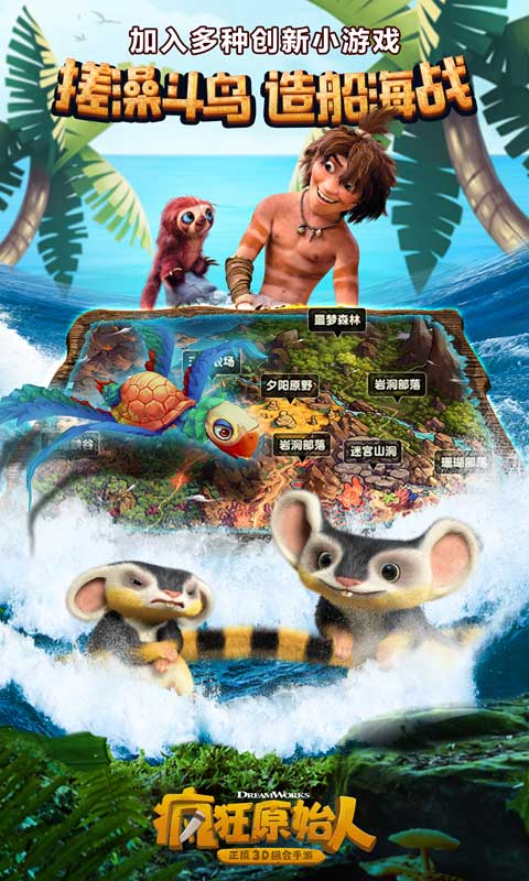 《疯狂原始人-正版3D回合手游》是由美国同名动画电影改编而成。画面视觉由梦工场严格监制把关,忠实还原电影中的冒险历程和丰富个性的原始宠物们。玩家将化身手执石矛穿兽皮的原始人,在瓜哥、小伊、坦克等人的陪伴帮助下来到史前一万年:探索世界、搜寻远古宝藏、并建立和壮大属于自己的部落家园。【游戏特点】