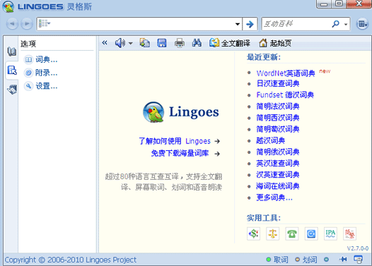 lingoes 灵格斯词霸是一款简明易用的翻译与词典软件,支持全球超过60多个国家语言的互查互译、支持多语种屏幕取词、索引提示和语音朗读功能,是新一代的词典翻译专家.