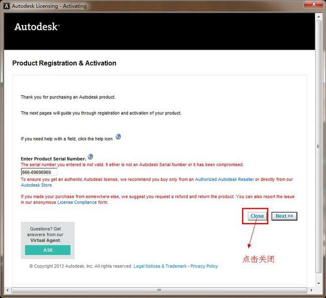 这里呢,我们发现并不是我们和我们之前的一样,有输入激活码区。所以有两种激活方法,一种是断网激活,另外一种就是本教程要讲述的:我们先点击关闭,关闭这次激活,然后返回到之前的激活界面 ,再重新点击激活,这时我们会发现自动跳转到输入激活码界面。 如图