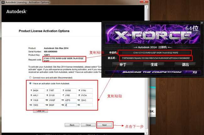 把3dmax2014 64位中文版里的申请号复制粘贴到注册机的申请号栏中,然后点击计算激活,生成激活码后,把激活码复制粘贴到3dmax2014 64位中文版激活栏中,最后点下一步 如图