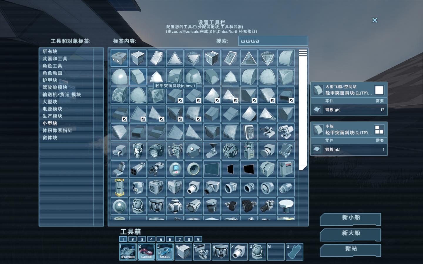 您在游戏中会经常接触G菜单与K菜单,当您不在载具内时,按下“G”键会调出如上图菜单,您需要将工具以及想要建造的方块拖动至下方快捷栏以使用。(注:游戏中有搜索功能,但是在打了汉化补丁之后搜索功能会失效)