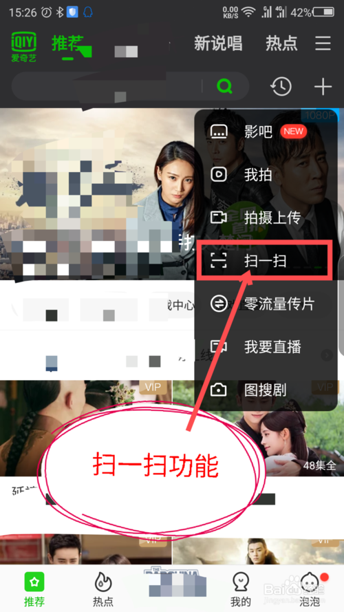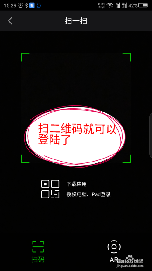 4、点击一下扫一扫,对着电脑屏幕上登录的二维码扫一下,在手机上操作就可以登录电脑版爱奇艺了。