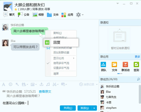 3、创建完成后,即可发送自己所需要的消息即可。(讨论组无需同意,直接进)