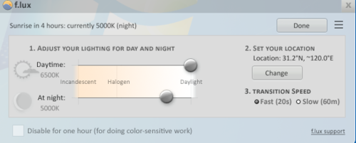 f.lux是一款可以根据时间自动调整频幕色温的护眼软件。一般我们到了中午的时候光线会上最强的时候,f.lux会帮你的自动调整到让你眼睛舒服的状态。【软件特色】
