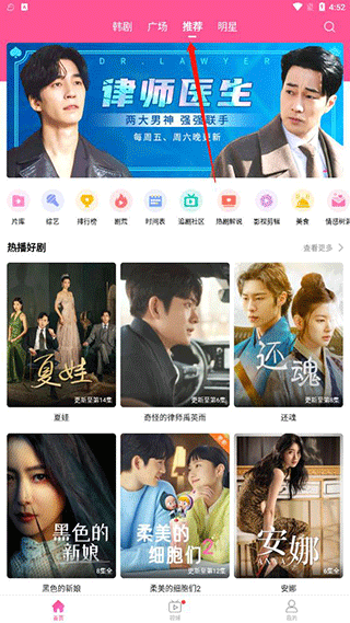 1、韩站首页包含四大版块,即韩剧、广场、推荐与明星。于“韩剧”版块内,能看到时下热门好剧,还有精选热剧、青葱少年时等各类分类。