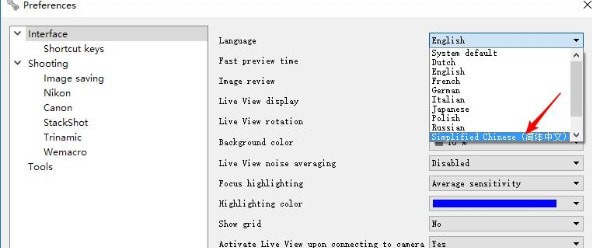 Helicon Remote中文设置方法Helicon Remote支持多国语言,支持简体中文,设置方法:File->Preference->Interface-language->简体中文,点击【ok】即可