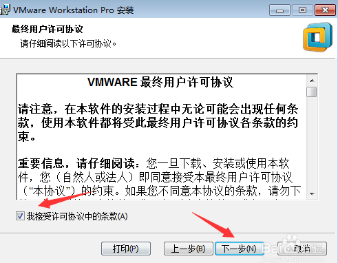 在弹出的“最终用户协议”窗口中,勾选“我接受许可协议中的条款”复选框,然后点击“下一步”按钮进入下一步;