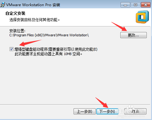 在弹出的“自定义安装”窗口中,可以点击“更改”按钮选择VMware Workstation的安装目录(本教程中采用默认目录)。选定安装位置后,勾选“增强型键盘驱动程序”,然后点击“下一步”按钮进入下一步;