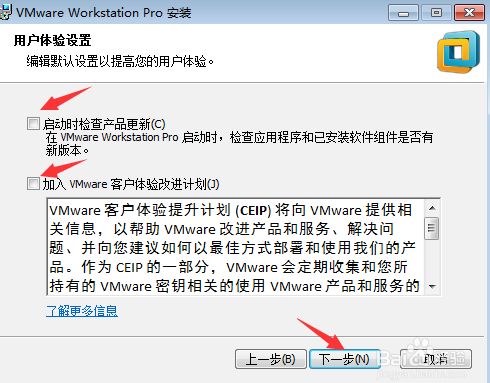 在弹出的“用户体验设置”窗口中,去掉“启动时检查产品更新”和“帮助完善VMware Workstation Pro(H)”复选框前的勾,然后点击“下一步”按钮进入下一步;