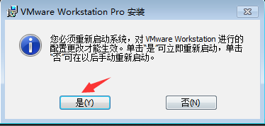 在弹出的“系统重启提示”窗口中,点击“是”按钮重启系统(这里也可以点击“否”按钮,等激活VMware Workstation 14 Pro后再重启。