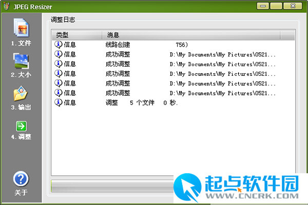 当设定完成之后,点击“调整”按钮即可按照前面所设置的参数进行图片调整,并显示调整日志,如下图所示: