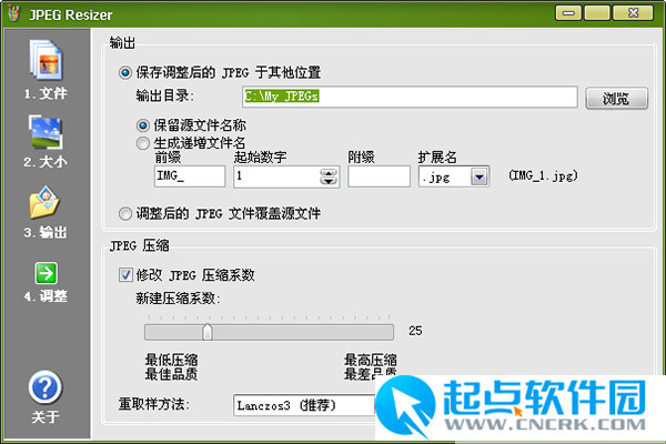 第三步:下载完成之后,双击JPEG Resizer.exe运行软件。首先进行输出设置,点击左边菜单栏中的“3.输出”,在右边窗口中可以设置调整后的图片文件输出路径,单击“浏览”,选择想要保存图片的文件夹,确定即可。也可以选择调整后覆盖源文件。这里还可以调整JPEG压缩系数,这里一般设置为1调整出来的图片最清晰。