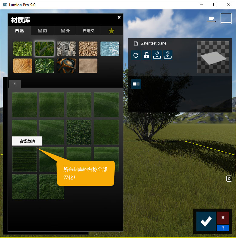 在Lumion中提供的所有材料都是最高质量的,并具有不同的风化形态、软化边缘(仅限Pro版本)等等。加上新增材料,Lumion 9中的材料总数达到1120种。