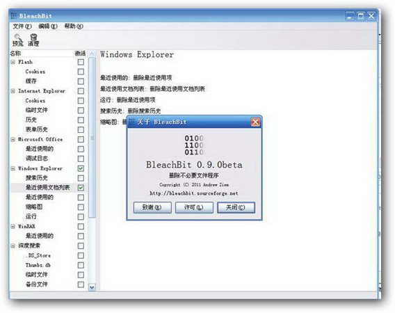 bleachbit 能快速清理磁盘空间,删除隐藏的垃圾文件,以及简单的保护你的隐私。擦除缓存、 删除cookies, 清除internet 历史, 删除未使用的本地化碎片日志,删除临时文件. 为 linux 和 windows 系统设计, 它能清除 70 种应用软件的残留数据,包含 firefox, internetexplorer, flash, google chrome, opera, safari, adobe reader, apt, 等等.除了简单地删除文件,bleachbit包括诸如粉碎文件,以防止恢复先进的功能,擦可用磁盘空间来隐藏其他应用程序已删除文件的痕迹,吸尘火狐使其速度更快。