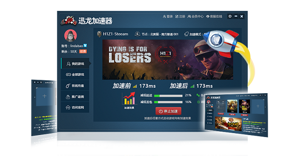 绝地求生轻量版加速器迅龙网游加速器是一款可以暂停的加速器,下线点暂停,时长永久保存!支持绝地求生、无限法则、彩虹六号、战地、GTA5、CSGO、LOL英雄联盟、CF穿越火线等上百款网游加速,有效解决网络延迟、掉线、卡顿等问题。【软件特点】