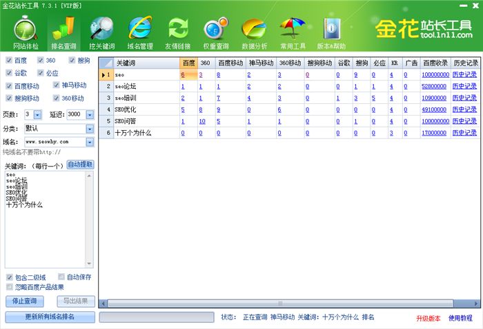 1、查询关键词排名:在域名框中输入想要查询的域名,然后在"关键词"文本框中输入你想要查询排名的关键词,然后直接点击"开始搜索"按钮即可。在你不了解按钮功能的情况下可以直接使用默认值。2、域名不可输入 http// 和其他URL只能使用纯域名。