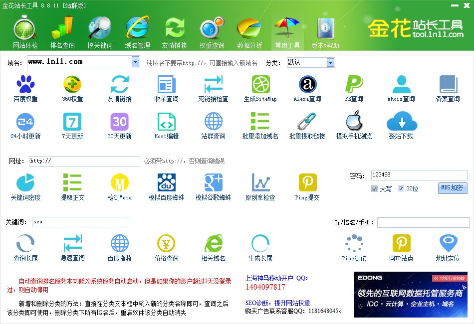 3、分类:直接在分类文本框中输入新的分类名称即可,查询之后该分类即可使用,删除分类下所有域名后,重启软件该分类自动消失。