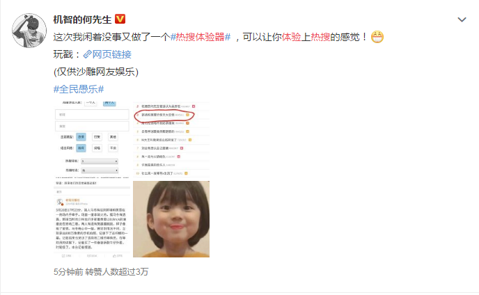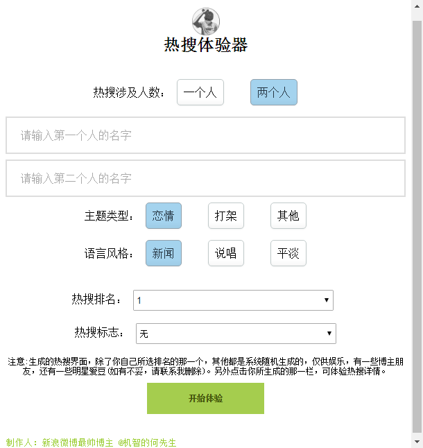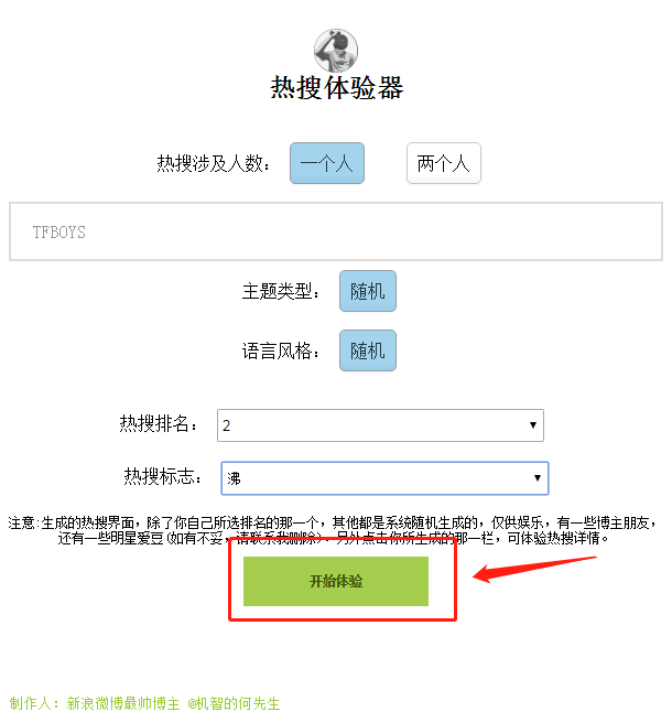 注意:生成的热搜界面,除了你自己所选排名的那一个,其他都是系统随机生成的,仅供娱乐,有一些博主朋友,还有一些明星爱豆(如有不妥,请联系我删除)。另外点击你所生成的那一栏,可体验热搜详情。【使用方法】