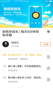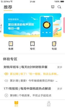 1、财税早班车----日更有声资讯栏目每天8分钟,知晓财税事。本栏目是为财税人员量身定制的一款财税知识早餐,致力于传播每日财税动态,聚焦新政热点。