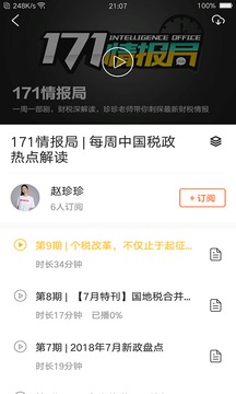 171情报局是一档真人脱口秀栏目。主要讲解在这个星期里财税圈里发生了什么事情?财税人员要注意什么?哪些机会哪些风险又出来了?听听专家怎么说?分享财务私房话,盘点财税新看点。为迎合财税人员对专业知识内容更新快的需求提供便利。