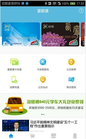 1、公交卡充值:在首页点击夏都通充值,选择充值金额后进行支付,根据提示将夏都通卡贴到图示位置后即可完成充值。2、余额查询:在首页点击卡余额查询,将夏都通卡贴到图示位置,即可完成充值。