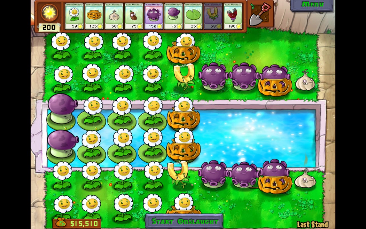 按以上方法,在Last Stand(谁笑到最后[年度版翻译为‘坚不可摧’])里摆阵(阳光不够,先忧郁菇、吸金石和右侧的金盏花),一局可以刷大概一万。(需要携带植物:大蒜、大喷菇、忧郁菇、南瓜头、咖啡豆、金盏花、睡莲、磁力菇、吸金磁)