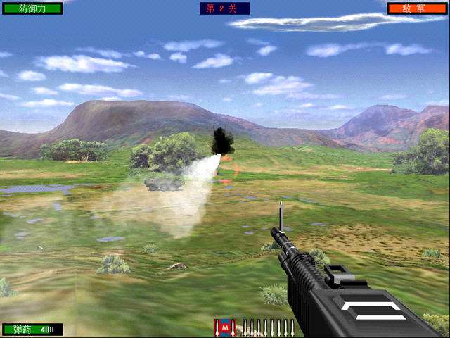 使用飞弹把运兵战车打爆炸。 当自己的大炮没有子弹,而敌军则还具有战车时,就只能操纵飞弹来打运兵战车了。点击M键,把准星移到战车身上,就会把运兵战车给打爆炸了,但是需要瞄的准一点哦。