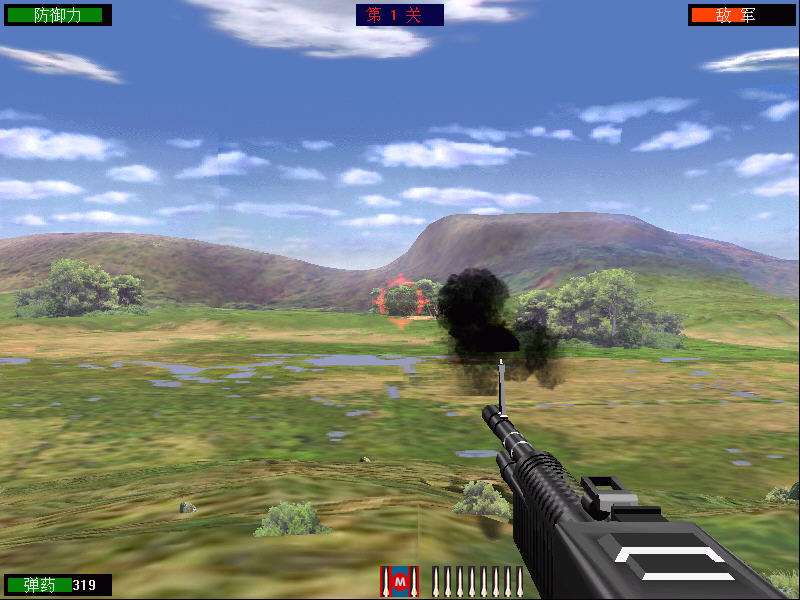 A、 机关枪:可攻击士兵、战斗机、直升机。 装甲运兵车铁门开启时,瞄准镜锁定门口,一车士兵将争先恐后地自动送死;如其已下车,应趁其未散开时,利用机枪自身惯性来一个扇面扫射;对付单兵应注意节约子弹;消灭伞兵时要考虑轻重缓急(话说回来,高处的目标你也不易打着。),特别应注意抓住机会补充给养;尽量用机关枪对付直升机。B、 穿甲炮:攻击坦克、装甲车、飞机、士兵。 切考虑弹道因素,抓好提前量;因弹药极有限,应注意节约,可用不可用的目标(如直升机、运兵车)尽量不用,好钢用在刀刃上;首先攻击坦克等将直接杀伤你的目标;无论如何留下一颗炮弹压箱底,以备不时之需。