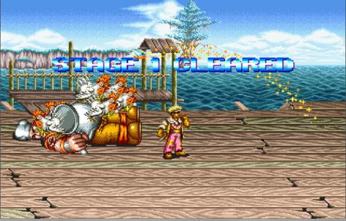 这关用老大彼得的腿技,能轻松过关,其他的人物可抓住时机跳打。