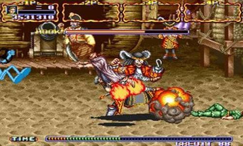 《铁钩船长》是90年代初由同名电影改编的街机游戏,又名《虎克船长》、《小飞侠》等。游戏的故事背景就是彼得潘--PETERPAN为了解救被劫持的孩子,召集伙伴们去消灭邪恶的铁钩船长。游戏最多可4人同时操作,一共有六关,有时间限制,如果长时间不前进会有飞鹰叼起主角往前飞,主角会去一点点血。所有角色在抓住敌人后都可以最高攻击五下(第五下会自动把敌人投出去),都可以空投。游戏中有多种道具可用,而挖掘游戏中众多隐藏的宝藏也是一种巨大的乐趣,而且这个游戏可以无限循环地打,高手都可以打N个小时以上,直到玩累了......基于以上种种原因,使得这个游戏在当时的游戏厅风靡一时,现在回顾这个游戏还是让很多人有所感触。