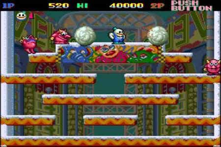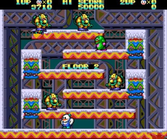 雪人兄弟代机厅我并没有见过,所以感情不深,但是大致的玩了几次,感觉东亚企划由于搁了4年才制作续作,系统和趣味性还是大有长进的,明显的吸收了很多后来出现的定搬游戏的风格,如收集字母来奖命,主角可以向下跳。不过这次的游戏主角不再孤单,除了雪人兄弟外,还有其他三位特异功能男孩鼎立加盟,分别拥有雷,水,风的力量。游戏的突出亮点是不在单纯的定版过关,第三关和最后一关要求主角突破复杂的障碍不停的往上跳,直到最高点的目的地,增加了游戏的难度和趣味性。但是相比之下,雪人的团球速度更快了,但是怪物的能力比起一作来能力更强,都各有一手,但是BOSS的难度不是很大,搞笑的风味十足。这款游戏还是很不错的。