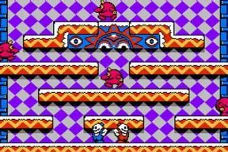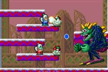 《雪人兄弟》这个游戏不同于一般动作游戏,它每一关的场景都是固定的,主人公是一对圆呼呼的雪人兄弟,而这对兄弟的敌人也是胖胖的显得挺憨的一些怪物。没有了面目可憎的敌人和刀山火海一般的场景,玩起来也就不那么紧张,并且游戏中各个角色的形象都让人忍俊不禁,因此这个游戏适合的玩家范围非常广,在各个游戏平台上面的受欢迎程度都相当不错,堪称经典。游戏过程是要消灭敌人的,而敌人是狡猾的。雪人要用自己的武器雪球,来把敌人封住,然后把变成一个大雪球的敌人推开,而变成大雪球的敌人也可以被当作武器砸飞其他的敌人,并且被大雪球砸飞的敌人会留下一些奖品,有的是寿司可以加分,有的是彩色的药瓶,分别可以加强雪人的攻击力,红瓶可以使雪人行走加速,蓝瓶可以加强雪人的火力,绿瓶可以使雪人变成巨型雪人并暂时无敌等。