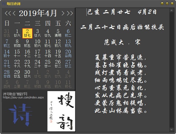 每日诗词提取工具是一款可以帮助用户朋友在Windows系统桌面上自动下载搜韵网当日诗词并显示的小工具,点击软件左侧的日期栏还可以下载显示对应日期的诗词,为每天的你都提供一篇诗词。【软件特点】