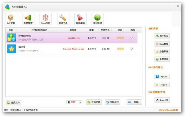 XAP安装器 V1.6 正式版 xap安装器是zune123开发的一款超强windows phone 7手机pc端工具。XAP安装器是针对Windows Phone 7平台量身定做的PC端同步工具,可以帮助WP7手机用户在电脑上实现下载WP7应用,查看联系人,发送短信、屏幕截图、一键越狱等实用功能。