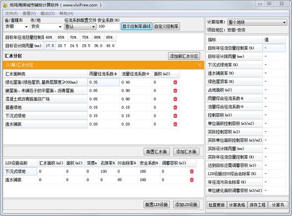 支持计算年径流总量控制率、下沉式绿地率、透水铺装率、绿色屋顶率、控制容积、单位面积控制容积等控制指标或引导性指标;支持多汇水分区计算;