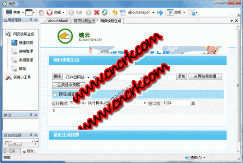 端云网页快照是一个专业的快照工具,集成了数据管理系统,对所有快照分类管理,自动保存最近的快照!可通过剪贴板自动获取网址,批量生成快照!