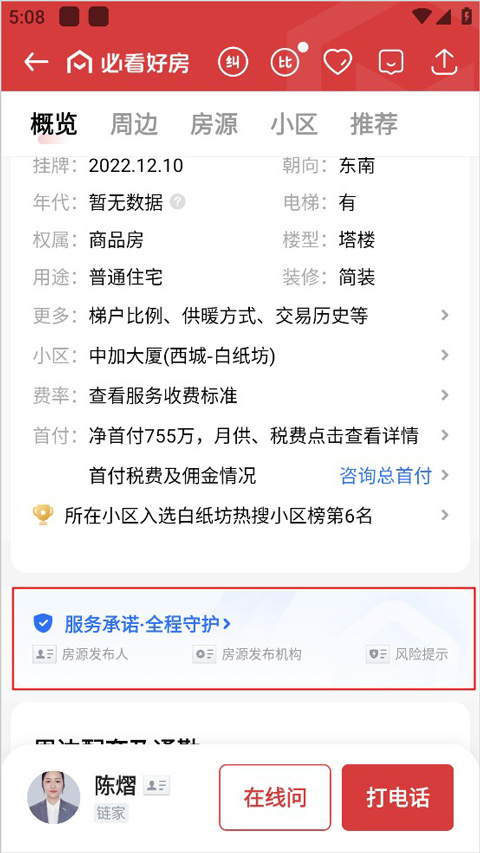 方式二:首先打开页面,接着点击任意一套二手房,然后点击任意一个经纪人的头像,从而进入经纪人点评页,最后点击“品质承诺”后的XX项服务承诺,如此便能够查看该经纪人所属品牌的服务承诺具体内容。