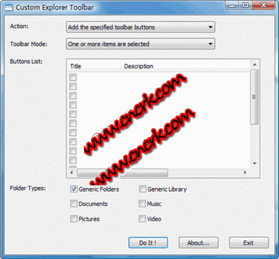 CustomExplorerToolbar V1.05 英文绿色免费版 customexplorertoolbar是一个windows 7资源管理器工具栏的自定义工具。你可以向资源管理器的工具栏中添加各种功能按钮,例如复制、剪贴等等。支持32位和64位windows 7,不支持windows vista