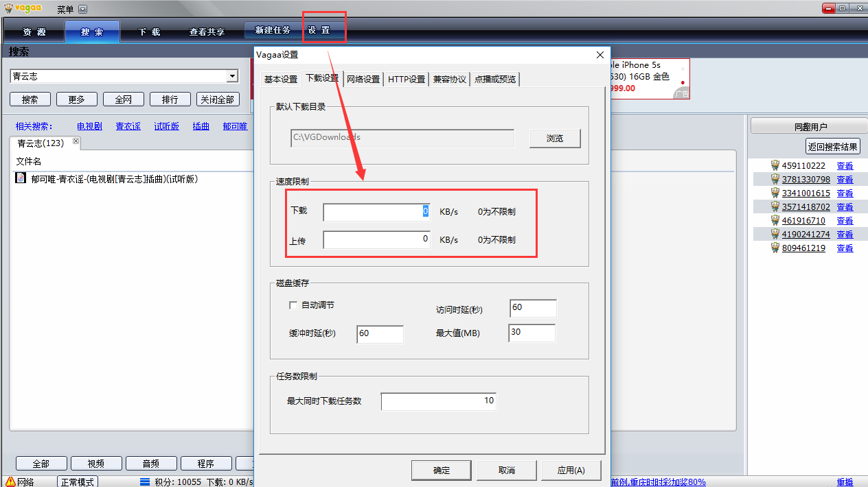 打开vagaa软件,点击【设置】,然后在弹出的对话框的【下载设置】栏中的速度限制下填写上上传的速度值,点击【确定】即可。