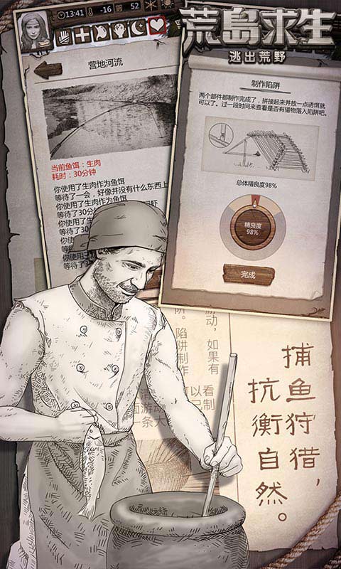 - 狩猎和捕鱼,在浅水中钓小动物,或者用矛枪冒险搜索更大的食物,扼杀资源之岛或维持和管理其发展。