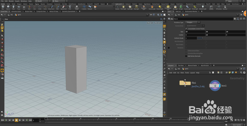 回到scene级别,选中建筑的Geometry节点。在Rigid Bodies工具架上使用RBD Fractal Object工具,把建筑模型变为破碎物体。