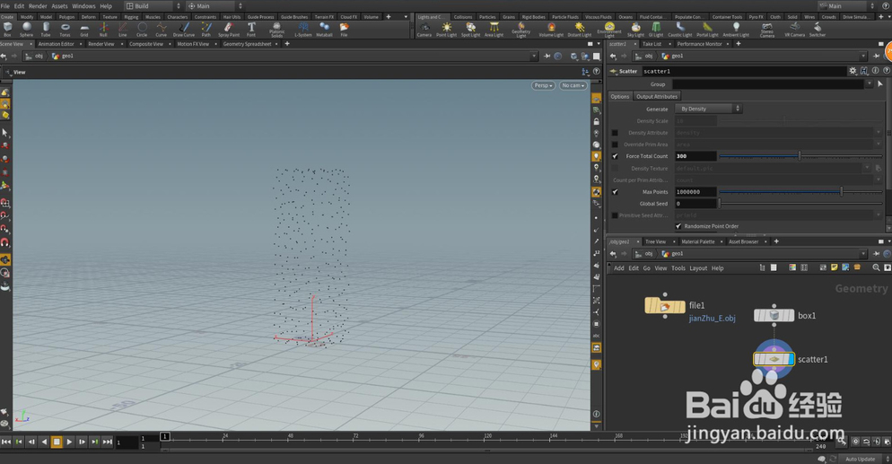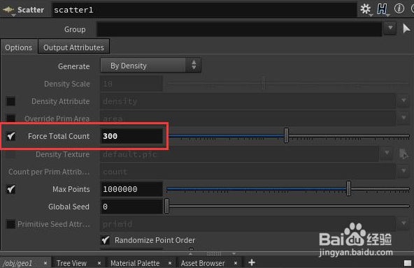 对BOX运用一个scatter节点,把BOX转换为点,并设置Force Total Count为300,这是点的数量,也就是后面破碎的数量。