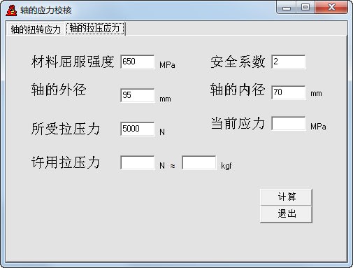轴的应力校核计算工具功能包括轴的扭转应力计算,计算空心轴最大扭转切应力,轴的拉压应力计算工具,校核轴的拉、压应力和扭转应力,可以更改材料强度数据、安全系数及轴的各个尺寸,计算轴可以承受的扭矩和拉、压力。