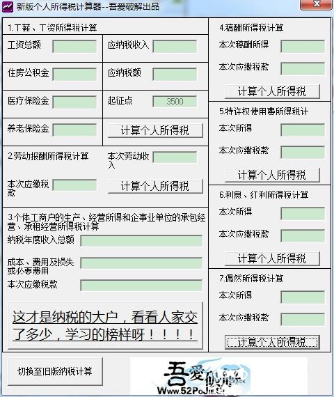 2019个税计算器绿色版体积小巧、界面简洁、使用方便,是各类行政、企事业单位的会计人员、办税人员的得力助手,相信使用本程序后定能大大减轻你们的工作量和提高你们的工作效率,让你再不必为在计算时该使用哪一级税率,速算扣除数是多少而烦恼。