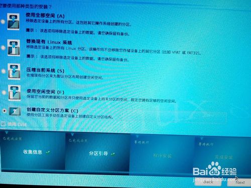 1、选择安装类型,我这里选“自定义分区方案”,我电脑里还有windows 7系统,组成双系统。然后点击“next”。