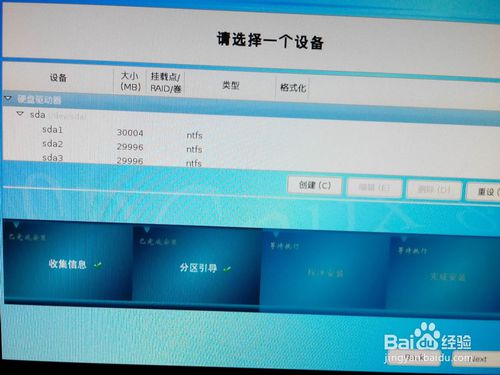 3、进入这个界面中,下拉找到你事先分出的空闲空间,选择“空闲空间”,点击“创建”,出现下面第二副图中对话框,默认标准分区,点击“create”,出现第三图中添加分区对话框,挂载点选/boot,文件类型选ext4,大小为500M,点“OK”,这样创建了一个boot分区。