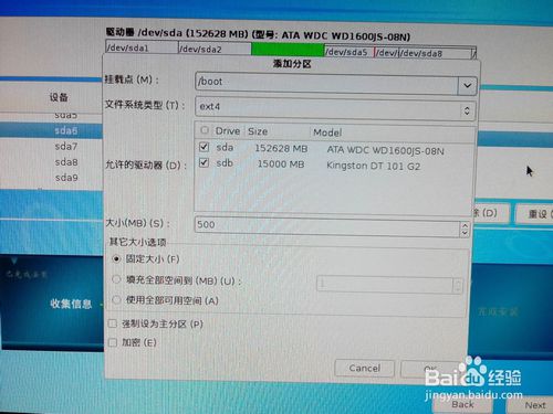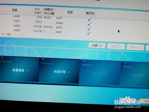 /boot500M (足够用了)/10G左右/home30G左右/swap2G左右(大约内存2倍,内存大于8G就不需要了)如果你硬盘比较大,你可以将/和/home多分一些,而且/也不需要太大,主要是/home应分大点。分区好了后,点击“next”开始安装步骤了。
