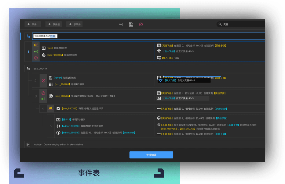 引擎内置了智能游戏逻辑事件表,无需编写复杂繁琐的代码