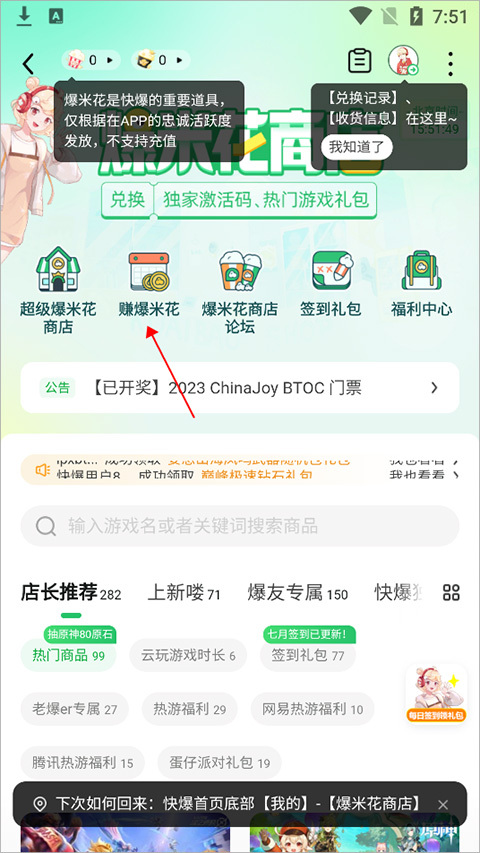 2. 进入爆米花商店,点击【赚爆米花】。